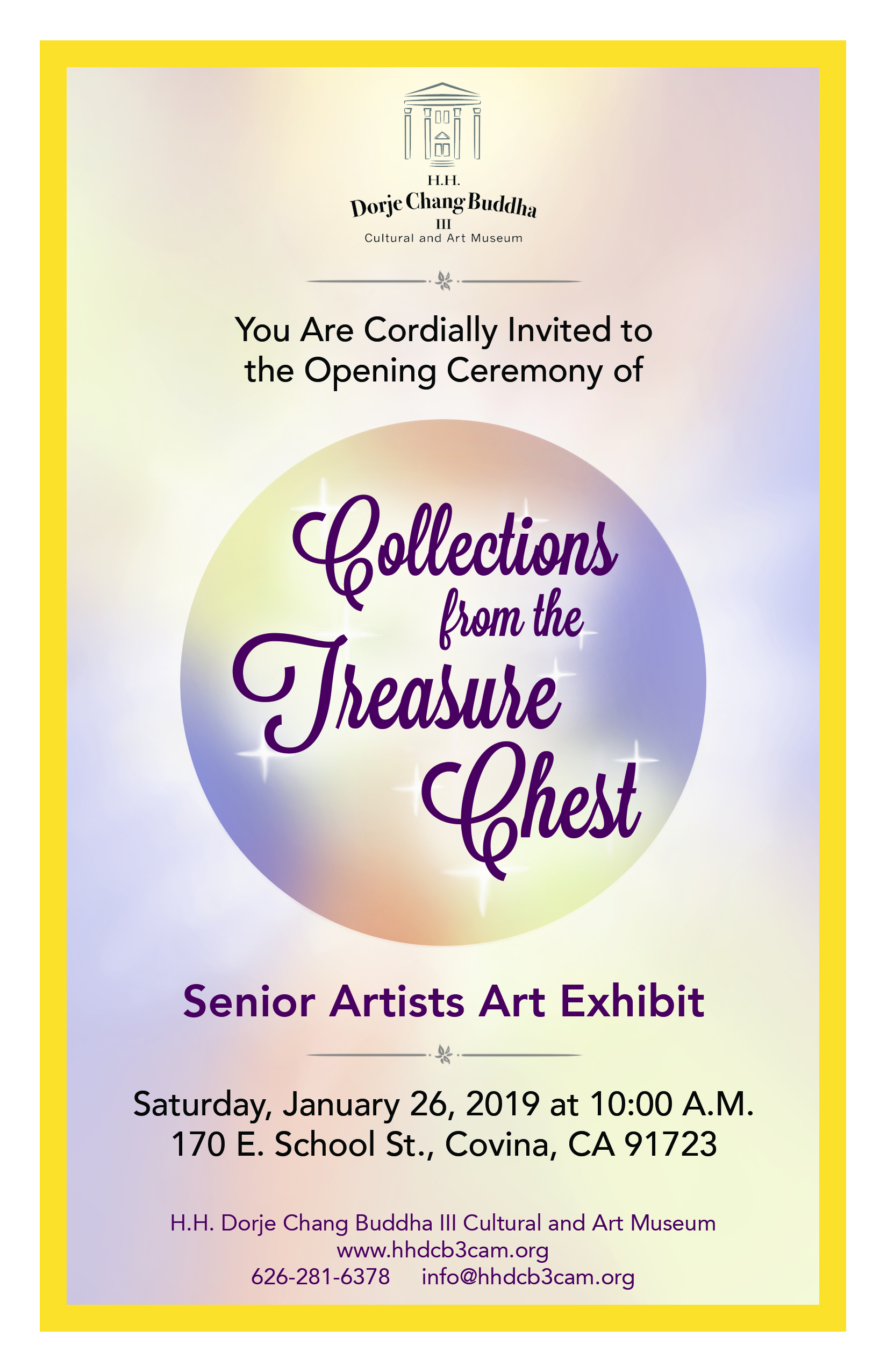 The Los Angeles Senior Artists’ Art Exhibit-Collection from the Treasure Chest is open for three weeks and will be closed on February 16, 2019. This is a public beneficial and free event. All is welcome to come and visit the exhibit. The address of the H.H. Dorje Chang Buddha III Cultural and Art Museum is 170 E School St., Covina, CA 91723, the phone number is (626)281-6378.