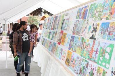 People viewing the art work display at the festival